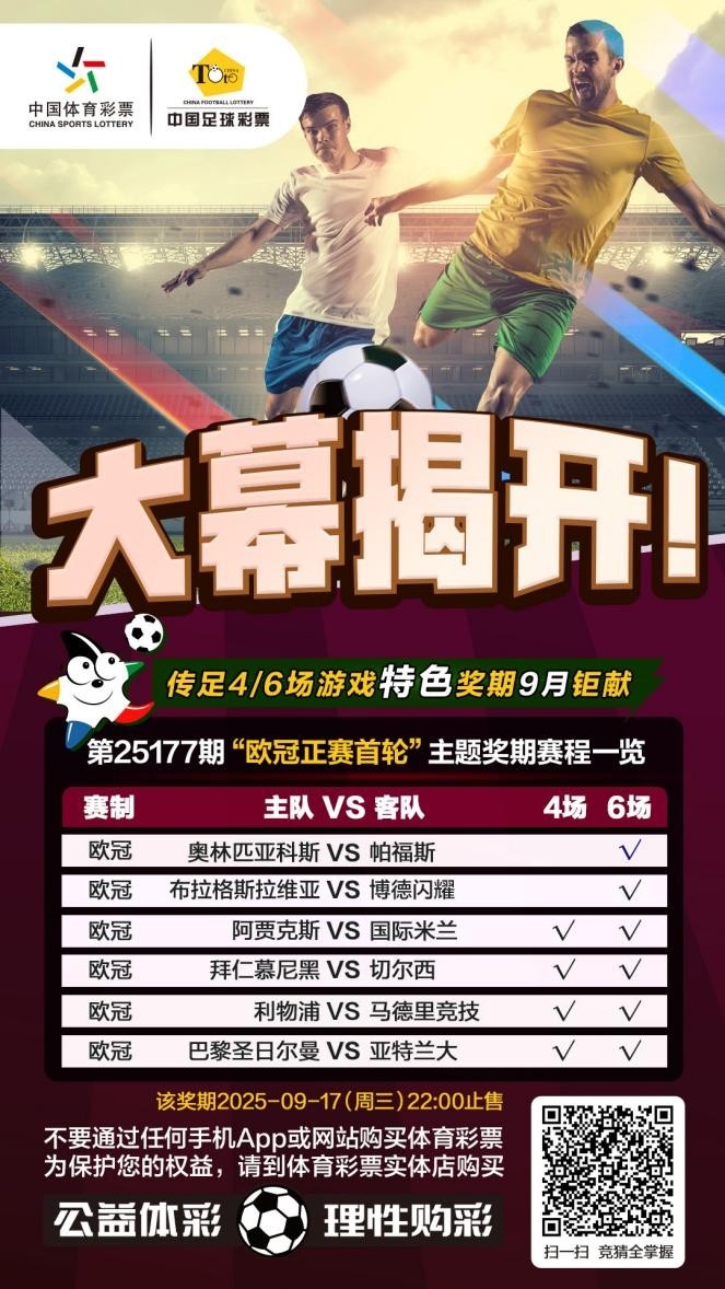 第25177期传足4/6场游戏特色奖期已经于2025年9月14日20:00开售,将于2025年9月17日22:00停售,并于9月18日开奖,其中阿贾克斯VS国际米兰、拜仁慕尼黑VS切尔西、利物浦VS马德里竞技和巴黎圣日尔曼VS亚特兰大为4场进球游戏竞猜赛事。
